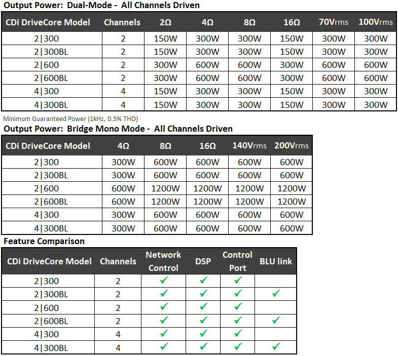 CDi DriveCore系列掀起了功放的革命性創(chuàng)新,呈現(xiàn)了令人刮目的高性能、豐富功能以及成本優(yōu)勢的完美組合。CDi DriveCore采用哈曼旗艦固定安裝功放(Crown DriveCore Install 系列)技術(shù),簡化了功能,幾乎適用于任何中小型固定安裝、電影院、零售店等應(yīng)用場合。CDi DriveCore系列設(shè)計旨在各種應(yīng)用場景中運用自如,擁有2或4通道配置,以及網(wǎng)絡(luò)控制/監(jiān)控、高電平DSP、前面板界面等,且無需外接變壓器也能驅(qū)動高達(dá)100Vrms定壓模式的揚聲器。此外,使用BLU link(BL 模式)還可改變通道數(shù)/輸出功率,實現(xiàn)了通過哈曼數(shù)字音頻總線收發(fā)通道的功能。